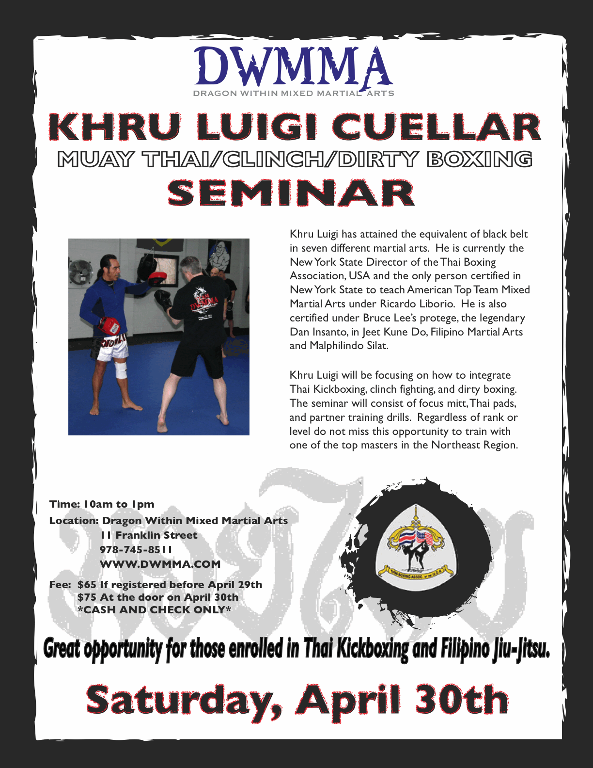 Khru Luigi Muay Thai/Clinch/Dirty Boxing Seminar On April 6, 2011 By Forged Bjj Krav MagaIn Uncategorized 42.526435 -70.898652 Share this: Share on Facebook (Opens in new window) Facebook Email a link to a friend (Opens in new window) Email Print (Opens in new window) Print Share on Reddit (Opens in new window) Reddit Like Loading... Related